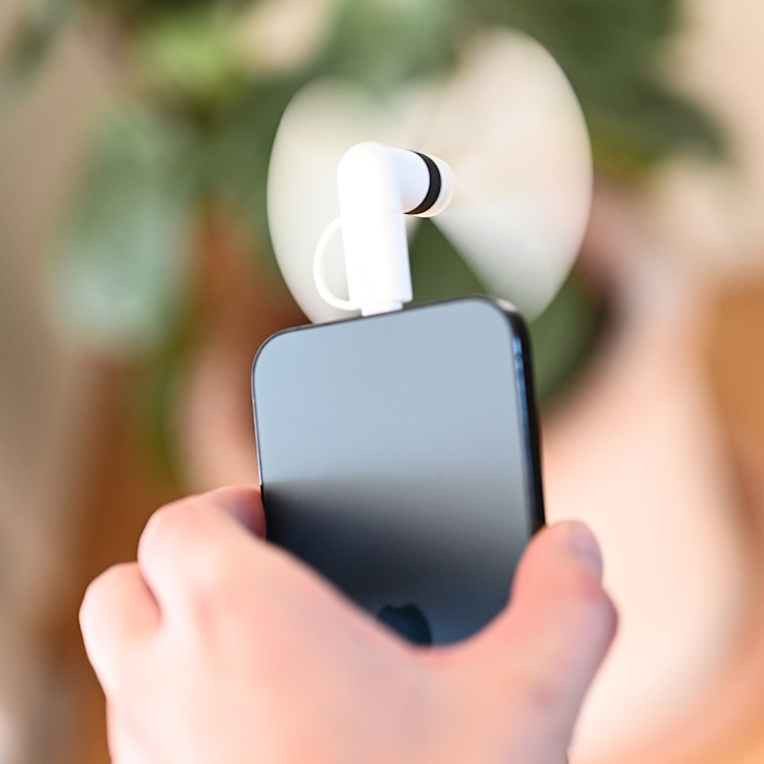 Liten og smidig håndvifte, perfekt og ta med sig på varme sommerdagar. Strømsparende og miljøvennlig vifte som lett koplet till både iPhone og Android gjennom den medfølgende adapteren.